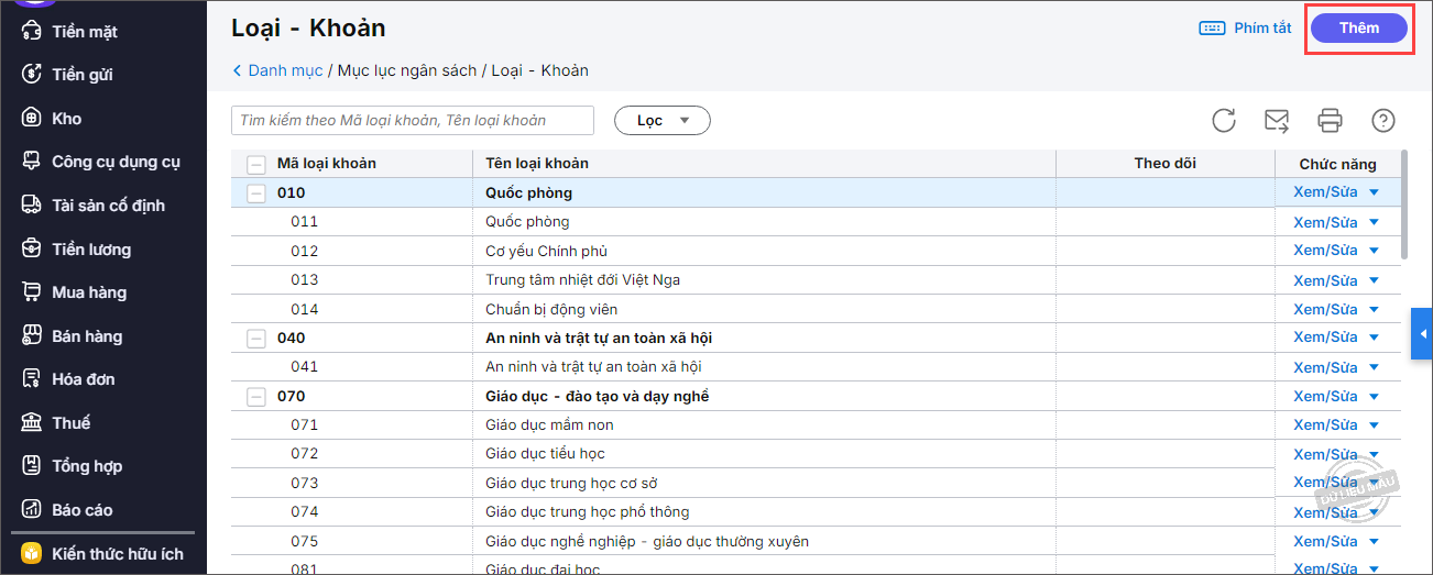 1. Chọn menu Danh mục/Loại khoản, chọn vào dòng loại khoản tổng hợp cần thêm, nhấn Thêm.