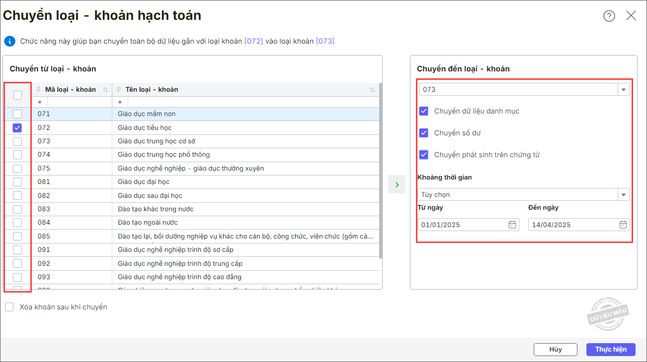 • Chuyển đổi dữ liệu danh mục: chuyển các thông tin liên quan đến các loại khoản được chọn trong các thiết lập về danh mục.