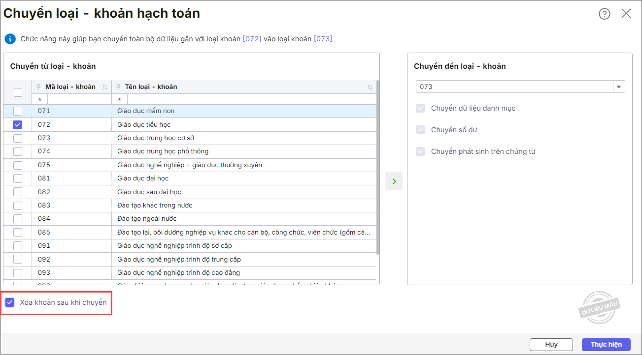 Lưu ý: Chọn Xóa khoản sau khi chuyển phần mềm mặc định chuyển toàn bộ các phát sinh liên quan (danh mục, số dư, chứng từ) sang loại khoản mới, đồng thời xóa loại khoản gốc.