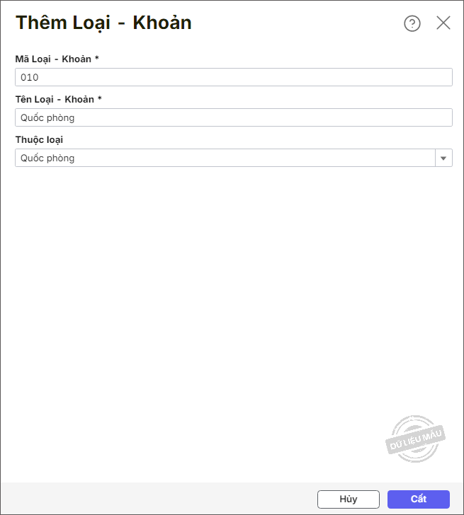 • Mã Loại – Khoản và Tên Loại – Khoản: bắt buộc nhập.
