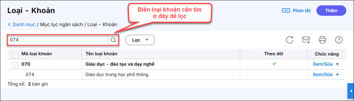 Bước 2: Nhập mã hoặc tên Loại/Khoản cần tìm vào ô tìm kiếm để tìm.