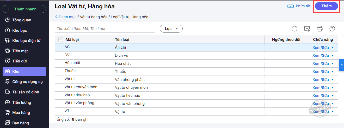 Bước 2: Để thêm mới loại vật tư hàng hóa, nhấn Thêm.