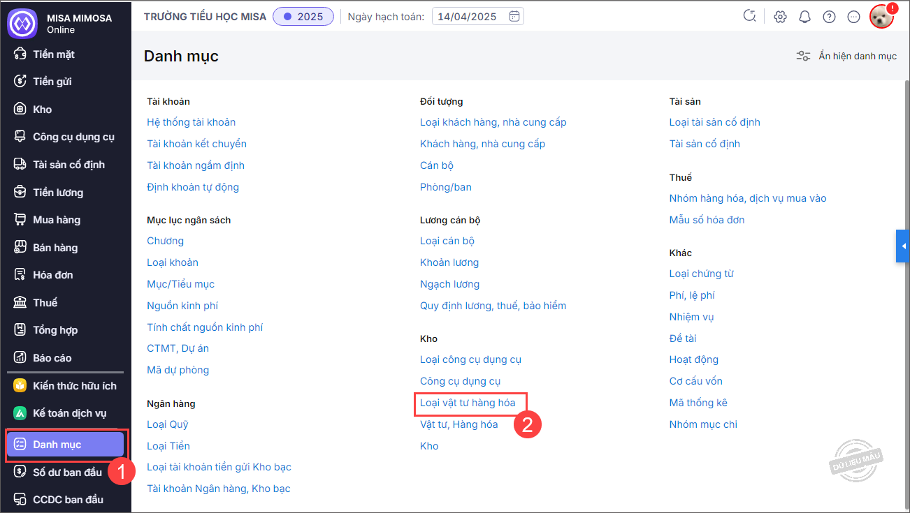 Bước 1: Chọn menu Danh mục\Loại vật tư hàng hóa.