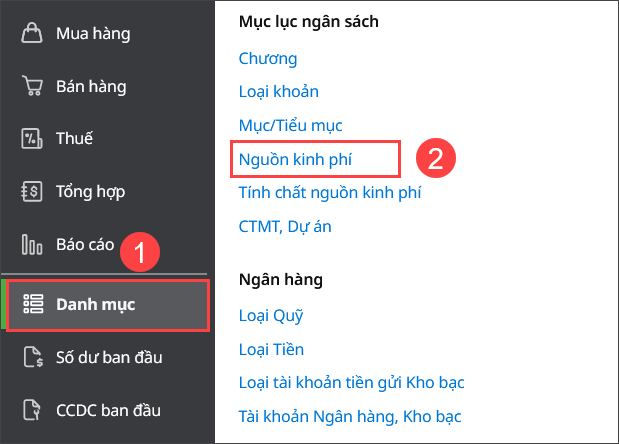 2.2. Giải phápKiểm tra và sửa lại mã cấp ngân sách cho từng nguồn kinh phí trong danh mục theo các bước sau: Bước 1: Vào Danh mục\Mục lục ngân sách\Nguồn kinh phí