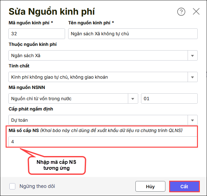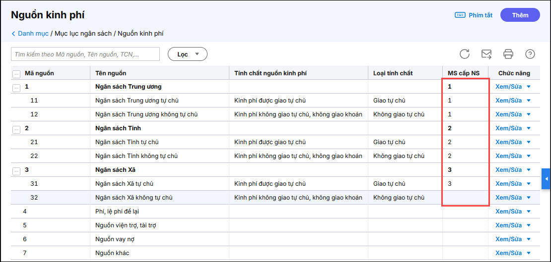 Bước 2: Kiểm tra các dòng Nguồn kinh phí của ngân sách tại cột MS cấp NS để biết nguồn nào đang bị chọn sai.