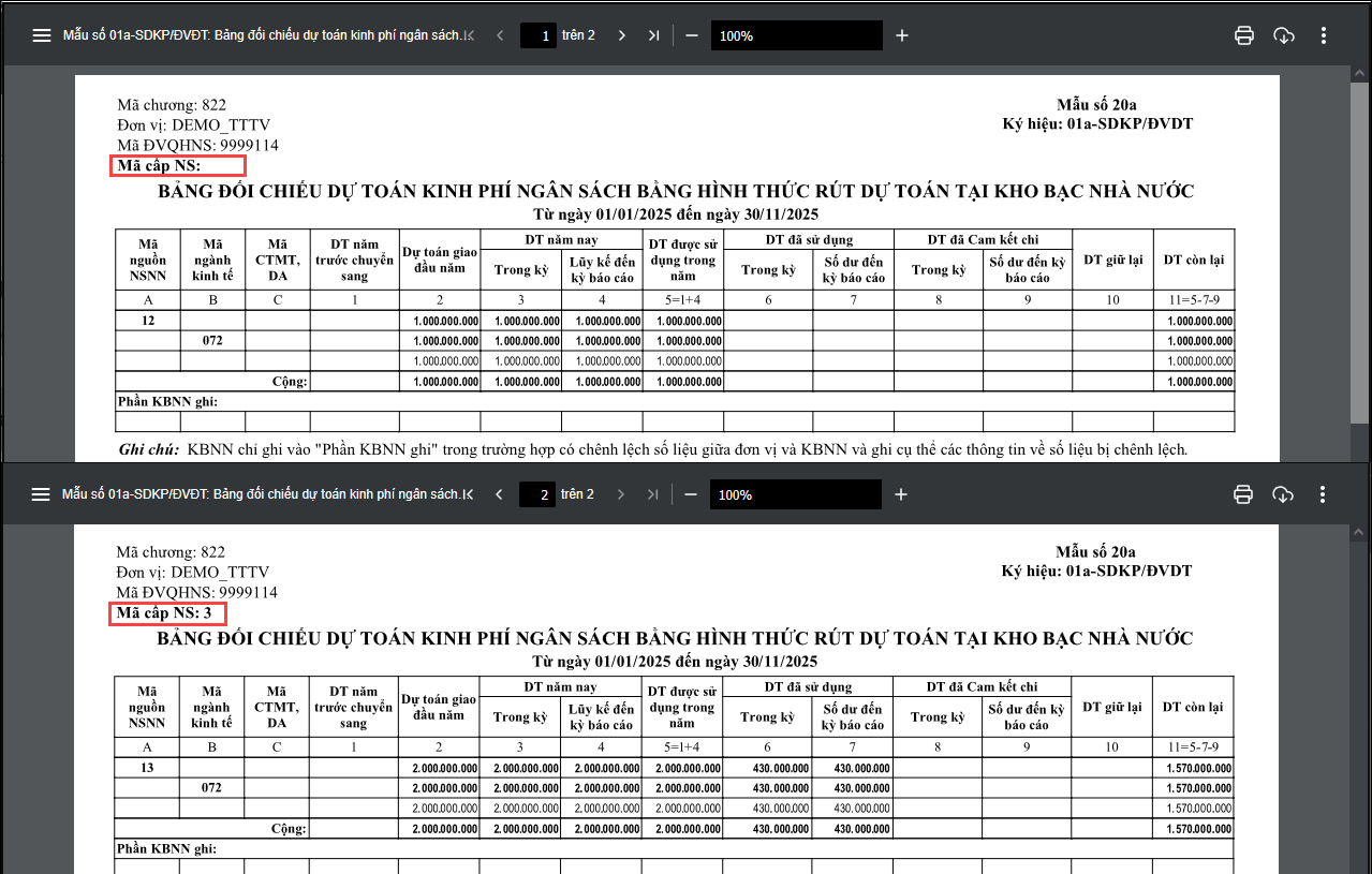 Báo cáo đối chiếu hiển thị sai mã cấp ngân sách (ví dụ đơn vị đối chiếu cấp 4 nhưng báo cáo lại lên cấp 1 hoặc cấp 3).