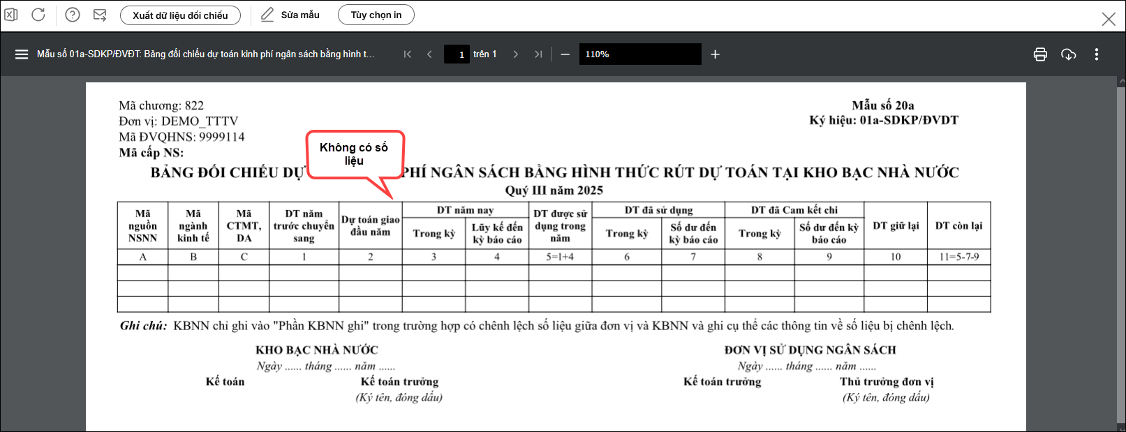 Khi in mẫu số 01a – Ký hiệu: 01a-SDKP/ĐVDT(Mẫu số 20a) không có số liệu thì làm thế nào?