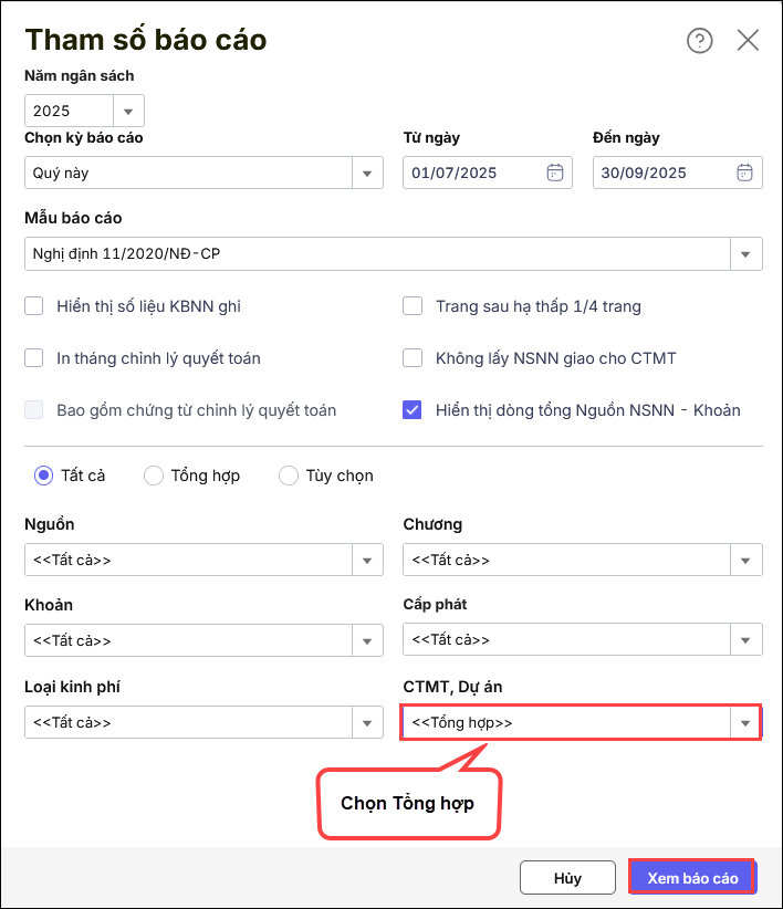 Bước 2: Khi mở báo cáo, tại tham số báo cáo tích chọn Tất cả, riêng CTMT, DA chọn là Tổng hợp. Nhấn Xem báo cáo.