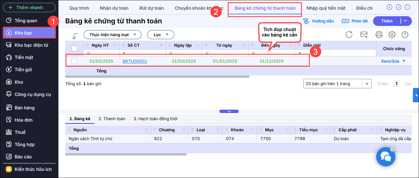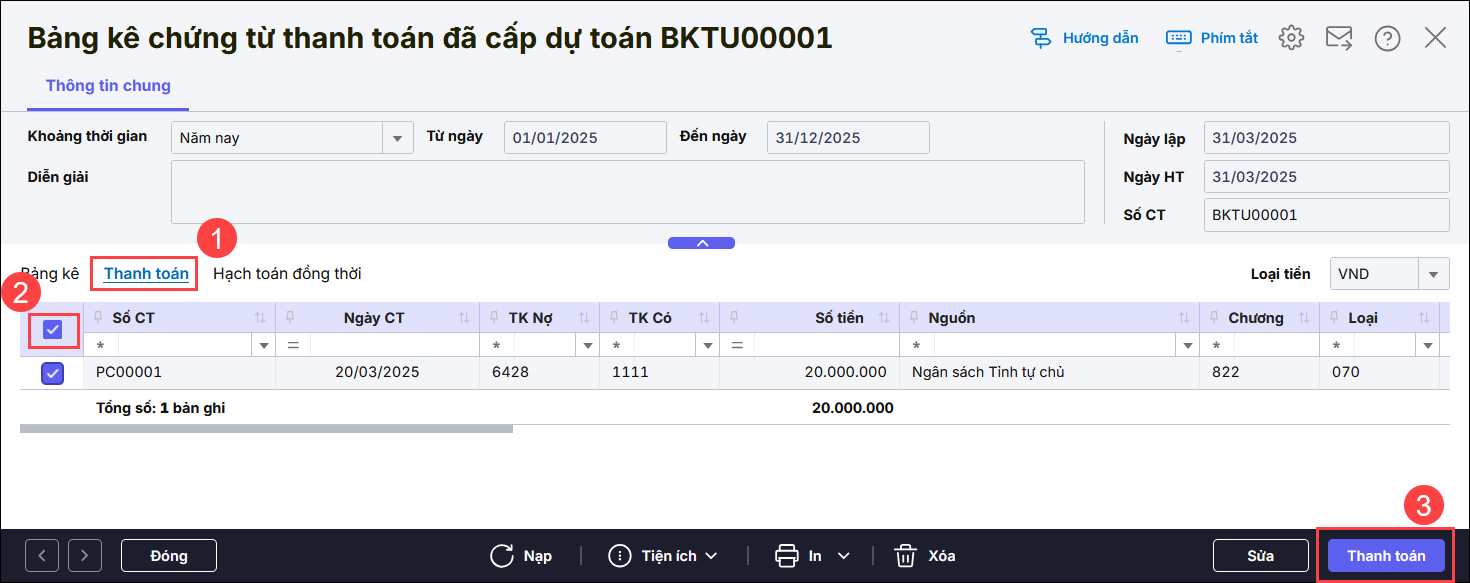 2. Nếu chưa lập bảng kê và chưa thanh toán tạm ứng, bạn xem hướng dẫn tại đây.