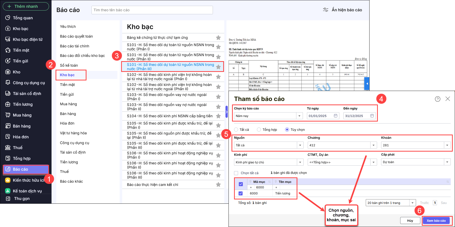 • Chọn tham số thời gian, Nguồn, Chương, Khoản, Mục bị sai số liệu. Nhấn Xem báo cáo