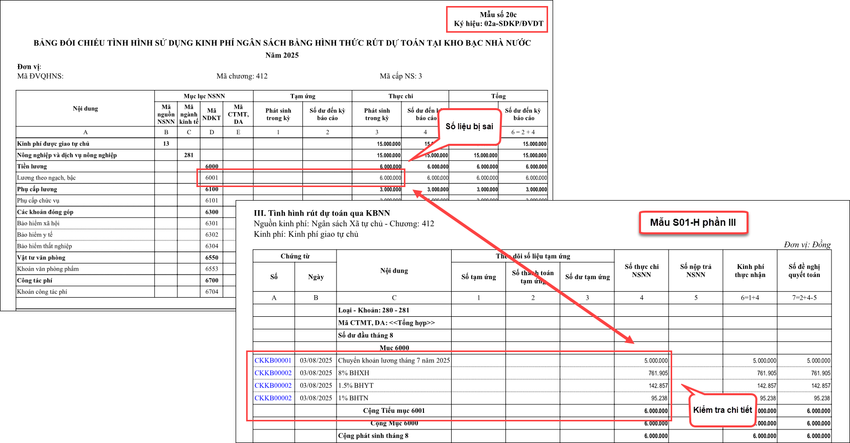 Ví dụ: Mục 6001, Nguồn Huyện tự chủ đang lên sai số liệu
