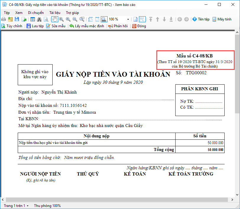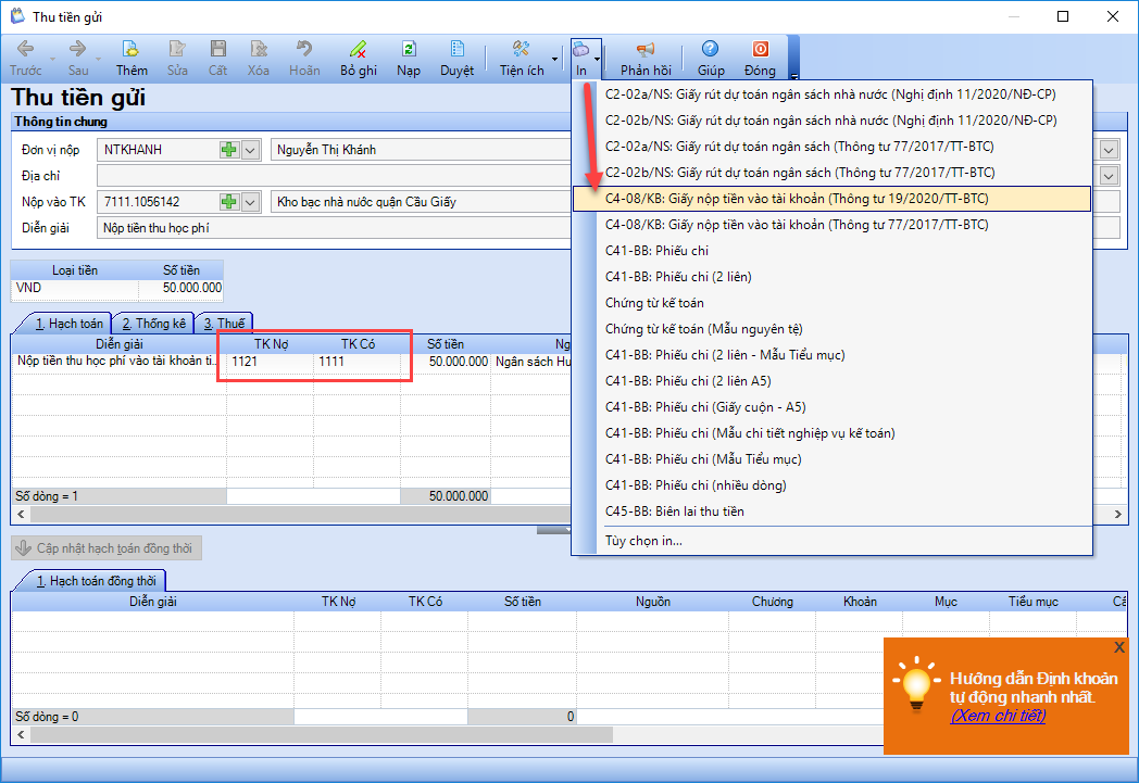 • Nhấn In\C4-08/KB: Giấy nộp tiền vào tài khoản (Thông tư 19/2022/TT-BTC).