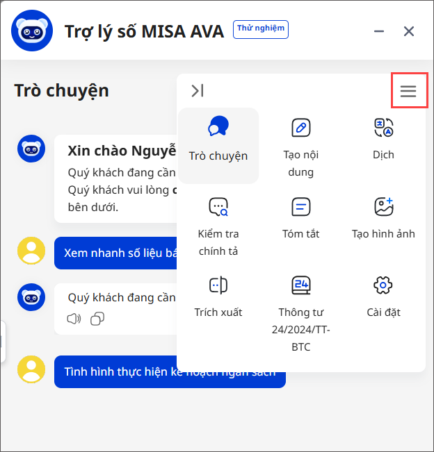 MISA AVA hỗ trợ một số tính năng khác AVA còn hỗ trợ một số tính năng hữu ích khác như:Tạo nội dung, Dịch, Kiểm tra chính tả,… Tùy theo nhu cầu mà anh/chị lựa chọn chức năng cần sử dụng. Lượt xem: 27 Cập nhật 18/08/2025 Bài viết này hữu ích chứ? Có Không Bài viết liên quan MISA AVA nhắc nhở nhà thầu giao hàng trước khi hết hạn hợp đồng MISA AVA tự động nhắc nhở kế toán lập chứng từ và thêm nhanh giấy rút dự toán màu cam MISA AVA hỗ trợ xem nhanh báo cáo MISA AVA hỗ trợ sử dụng phần mềm Giải đáp miễn phí qua facebookNếu bạn vẫn còn thắc mắc hãy đăng câu hỏi vào cộng đồng MISA qua facebook để được giải đáp miễn phí và nhanh chóngĐĂNG BÀI NGAY