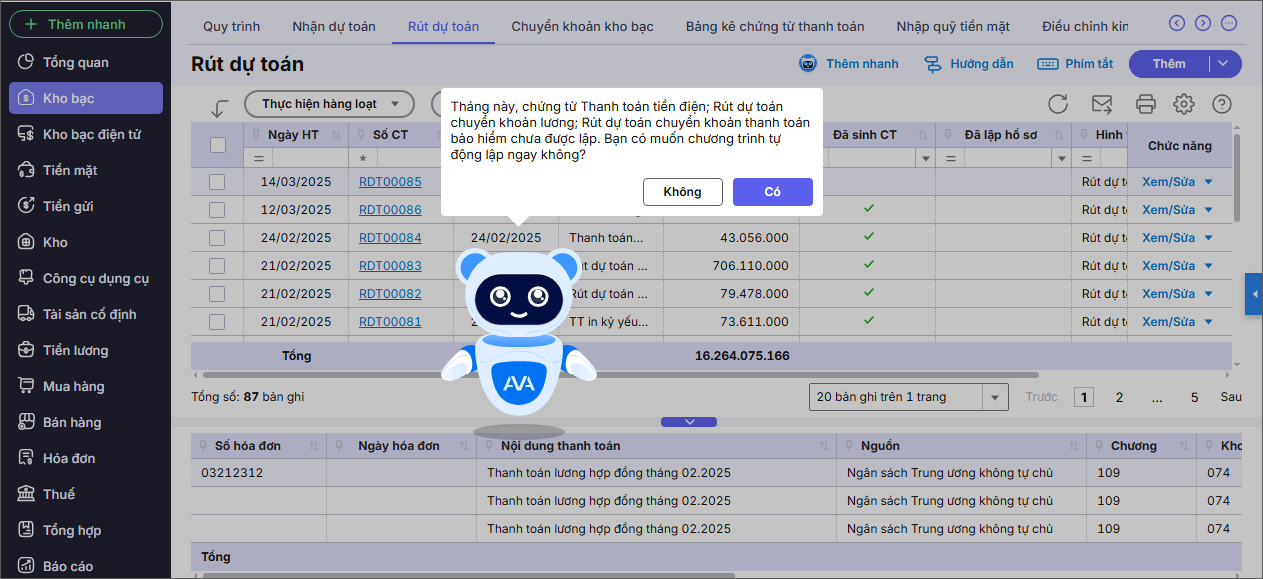 - Khi truy cập phần mềm, AVA sẽ tự động thông báo các chứng từ thanh toán định kỳ như tiền điện, nước, lương… trong tháng chưa lập.