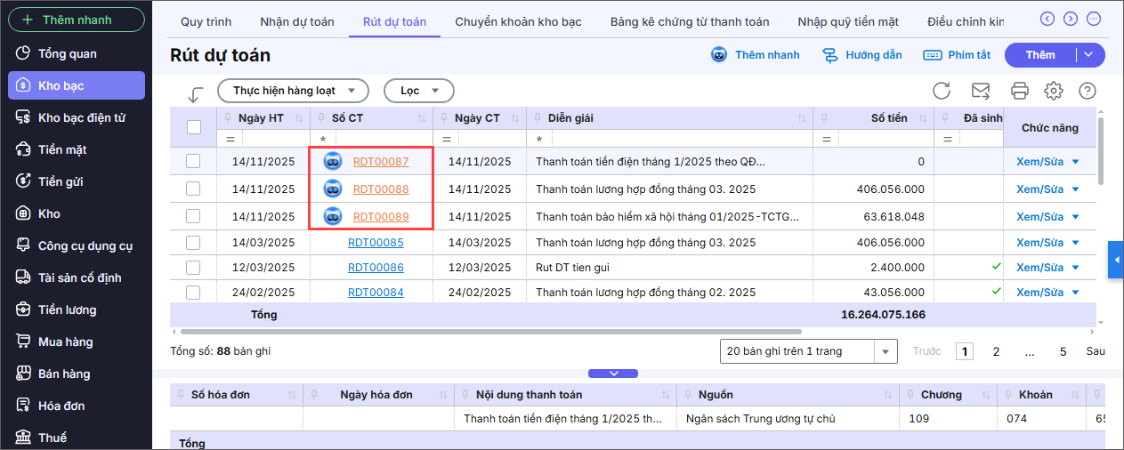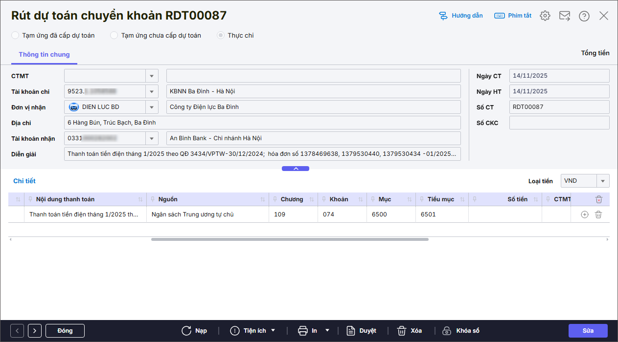- Kiểm tra lại số tiền và các thông tin khác sau đó nhấn Cất và ghi sổ chứng từ và sinh chứng từ chuyển khoản kho bạc, chuyển khoản vào tài khoản tiền gửi trả lương, phiếu thu rút dự toán nhập quỹ tiền mặt.