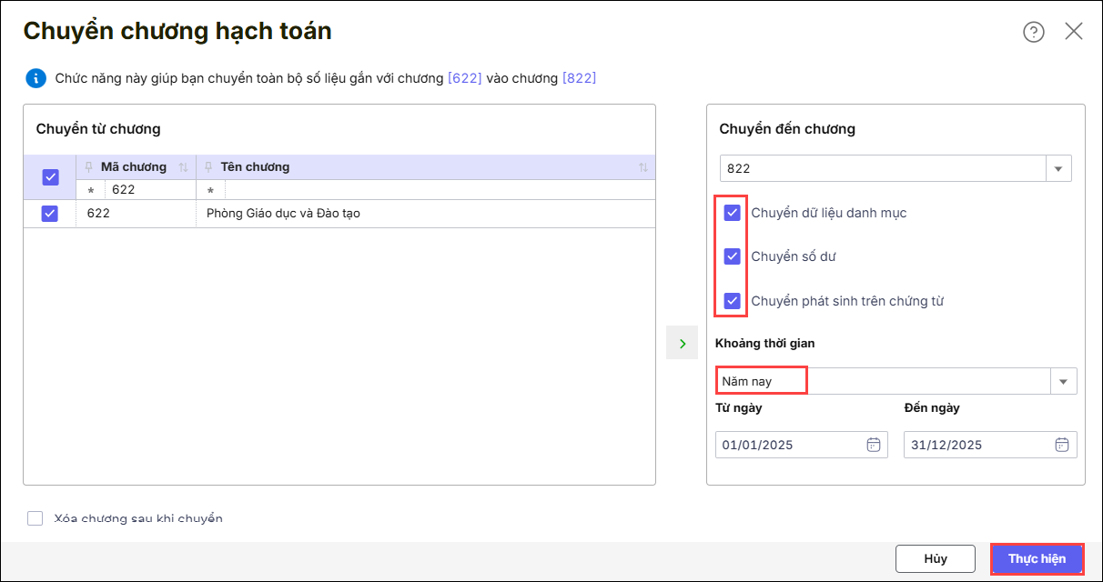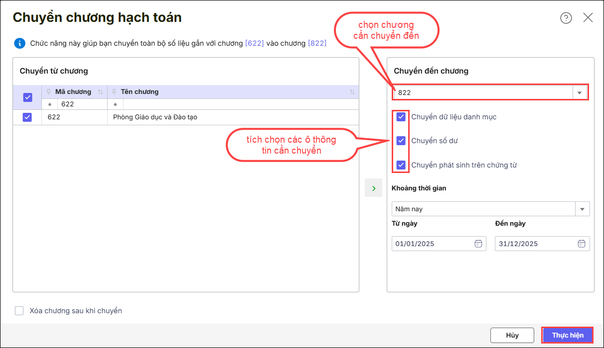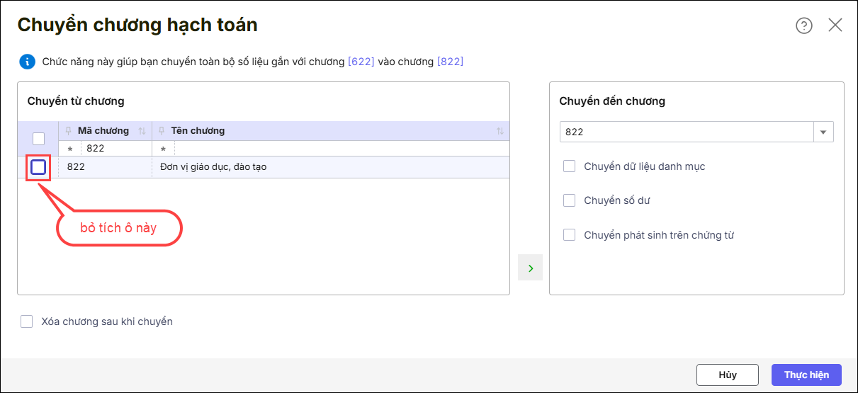 Bước 1: Tại phần chương chuyển đến/Chọn chương cần chuyển đến, ví dụ chuyển từ chương 622 sang 822 thì chọn chương cần chuyển đến là chương 822