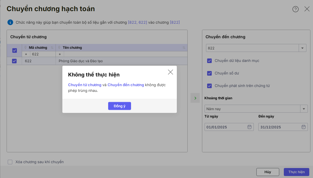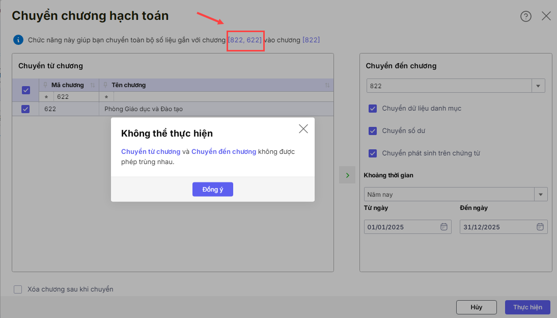 Do đơn vị chọn chương chuyển đi trùng với chương chuyển đến. Ví dụ như hình: đơn vị đang chọn chuyển từ chương là 822 và 622,chuyển đến chương là 822 nên đang bị trùng chương 822