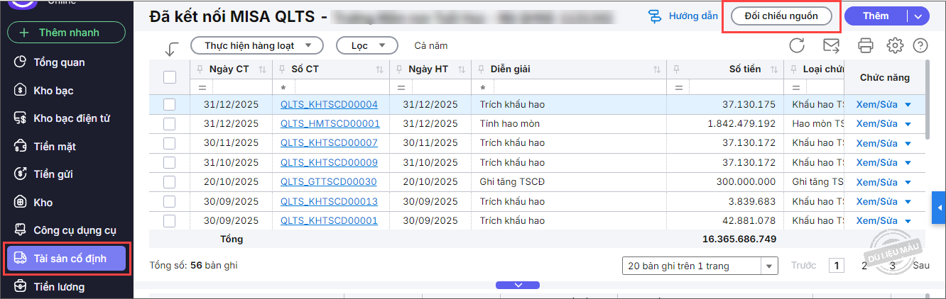 - Vào phân hệ Tài sản cố định, nhấn Đối chiếu nguồn.