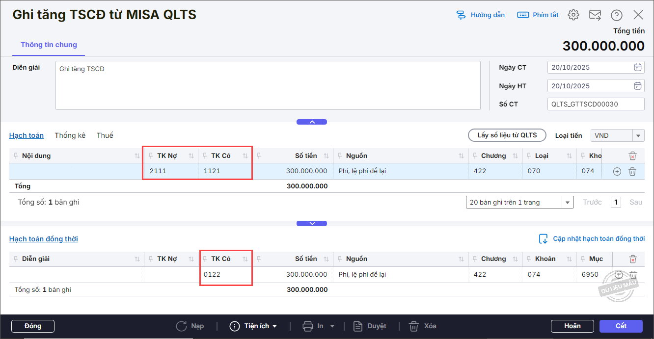 - Mở chứng từ ghi tăng TSCĐ vừa lấy từ phần mềm MISA QLTS để kiểm tra bút toán hạch toán đã đúng chưa. Nếu sai, nhấn Sửa để sửa lại bút toán hạch toán cho phù hợp với hình thức mua tài sản. Ví dụ như ở đây phần mềm đã hạch toán đúng rồi, anh/chị chọn thêm Tài khoản NH, KB để hạch toán chi mua TSCĐ bằng tiền gửi.