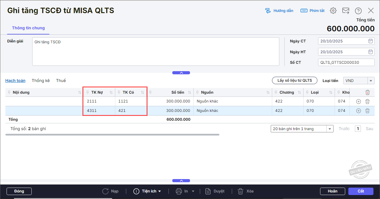 Mua sắm TSCĐ bằng quỹ phát triển hoạt động sự nghiệp (Theo dõi trên MISA QLTS)