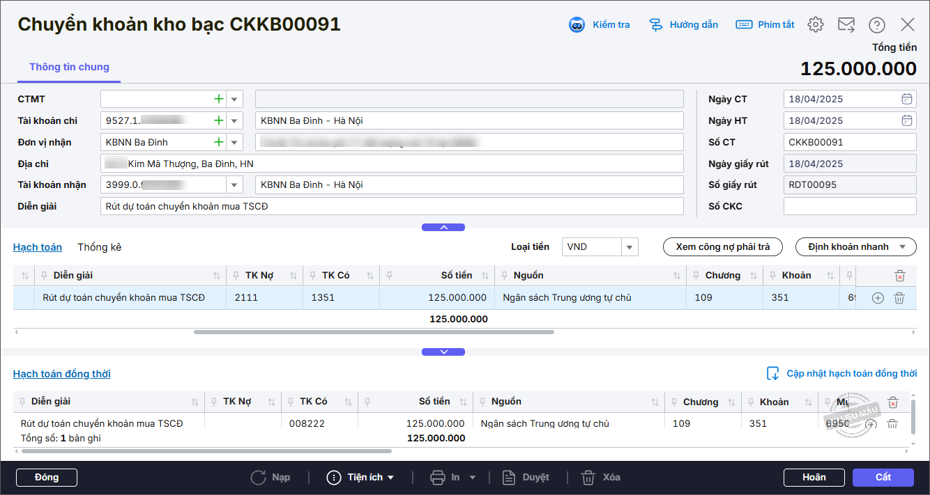 Bài viết hướng dẫn anh/chị hạch toán và các bước lập chứng từ rút dự toán chuyển khoản mua sắm Tài sản cố định (TSCĐ) từ nguồn Ngân sách Nhà nước (NSNN). Hướng dẫn này áp dụng cho trường hợp đơn vị không sử dụng phân hệ TSCĐ và không sử dụng phần mềm iHOS Quản lý tài sản.