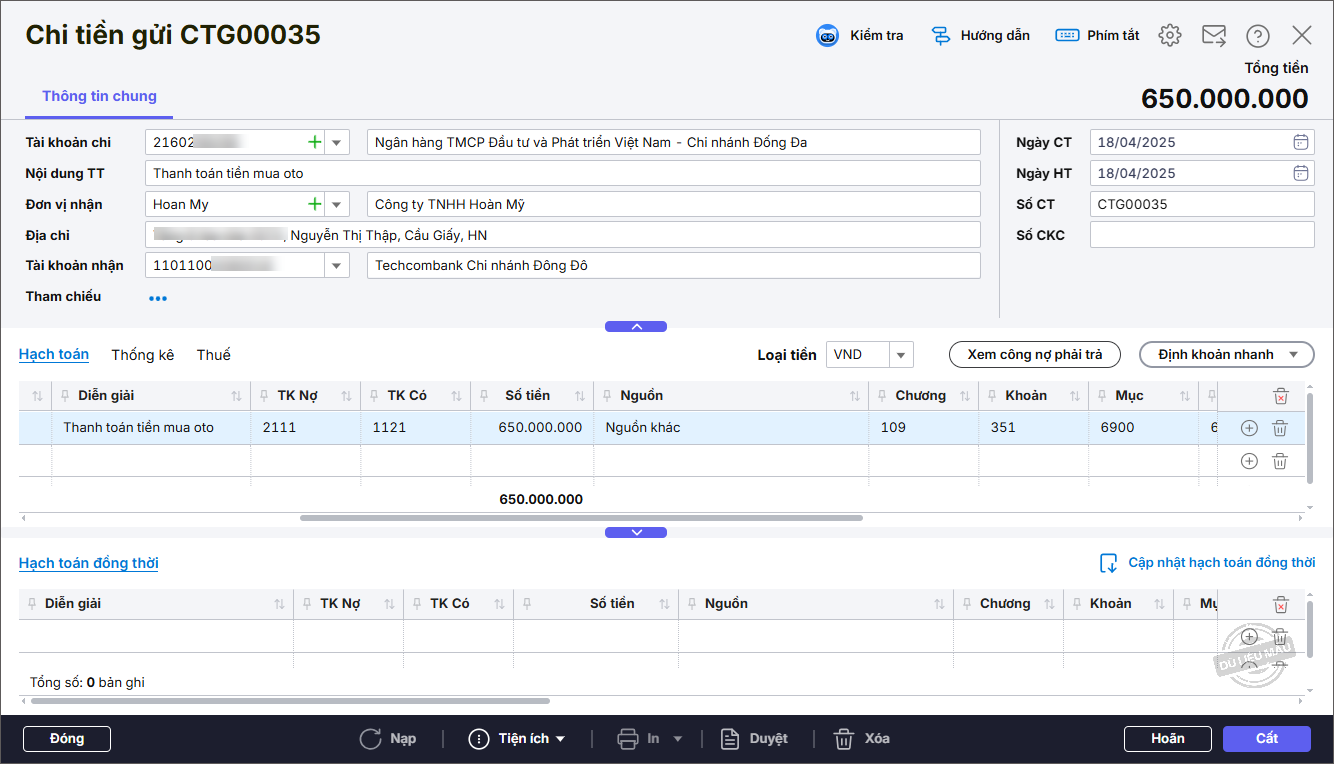 Bước 2: Khai báo các thông tin trên chứng từ Chi tiền gửi.