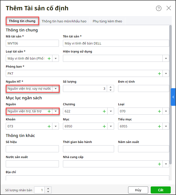 2. Khai báo thông tin tại mục Thông tin chung: Mã tài sản, Tên tài sản, Loại tài sản, Phòng/Ban, Nguồn HT: Nguồn viện trợ, vay nợ nước ngoài và 1 số thông tin khác.