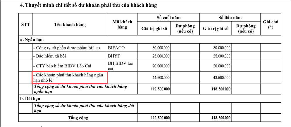 Bài viết này giúp anh/chị giải đáp được thắc mắc khi xem  báo cáo B04/BCTC: Thuyết minh báo cáo tài chính thấy chỉ tiêu III.4 Thuyết minh chi tiết số dư các khoản phải thủ ngắn hạn và dài hạn có hiển thị 1 dòng tên khách hàng là “Các khoản phải thu khách hàng ngắn hạn nhỏ lẻ”.