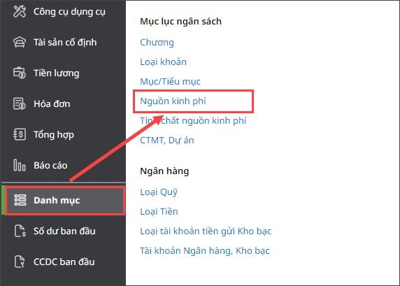 4.1 Thêm nguồn kinh phí cải cách tiền lươngBước 1: Vào Danh mục\Nguồn kinh phí.