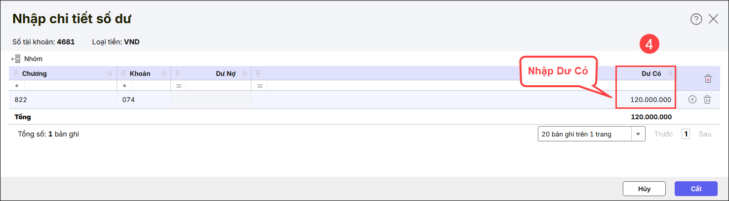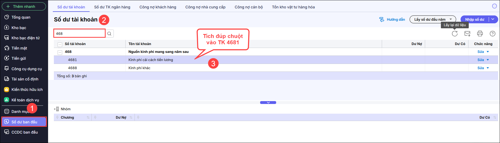 Bước 4: Nhấn Cất. 4.2 Nhập số dư đầu kỳ năm trước chuyển sang của nguồn CCTL sẽ được nhập vào số dư Có TK 4681Bước 1: Vào Số dư ban đầu, tích chuột vào Tìm kiếm gõ TK 4681, tích đúp chuột vào TK 4681