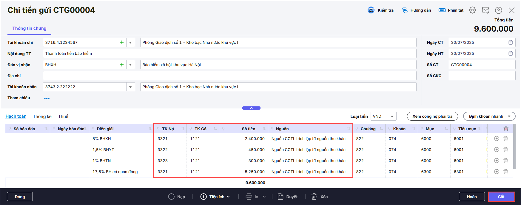 4. Chi nộp bảo hiểm từ nguồn CCTLBước 1: Vào Tiền gửi\Chi tiền\Chi tiền gửi. Bước 2: Hạch toán Nợ TK 332/Có TK 112: 9.600.000 đồng.