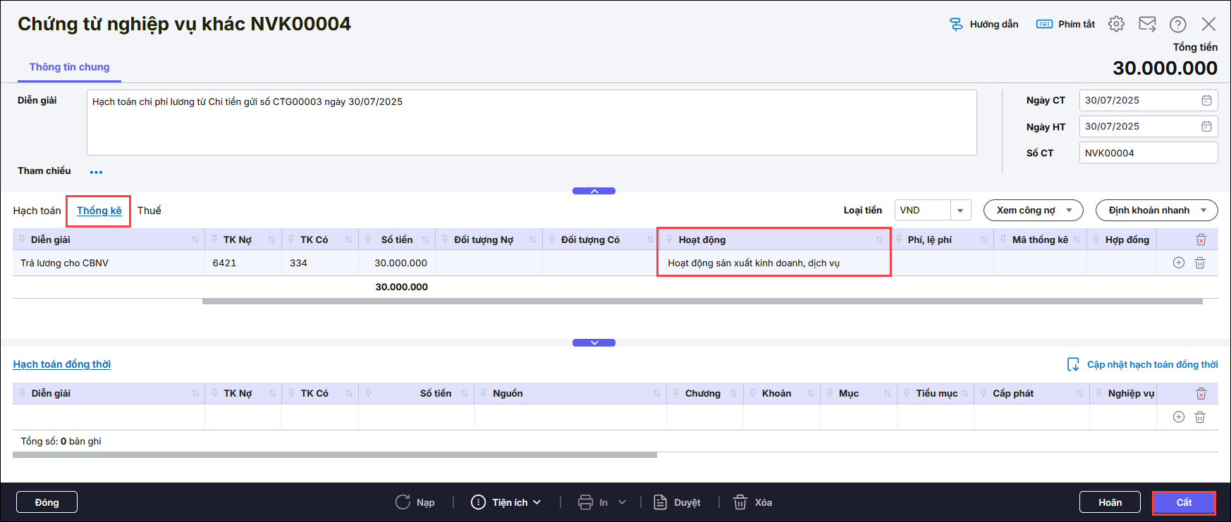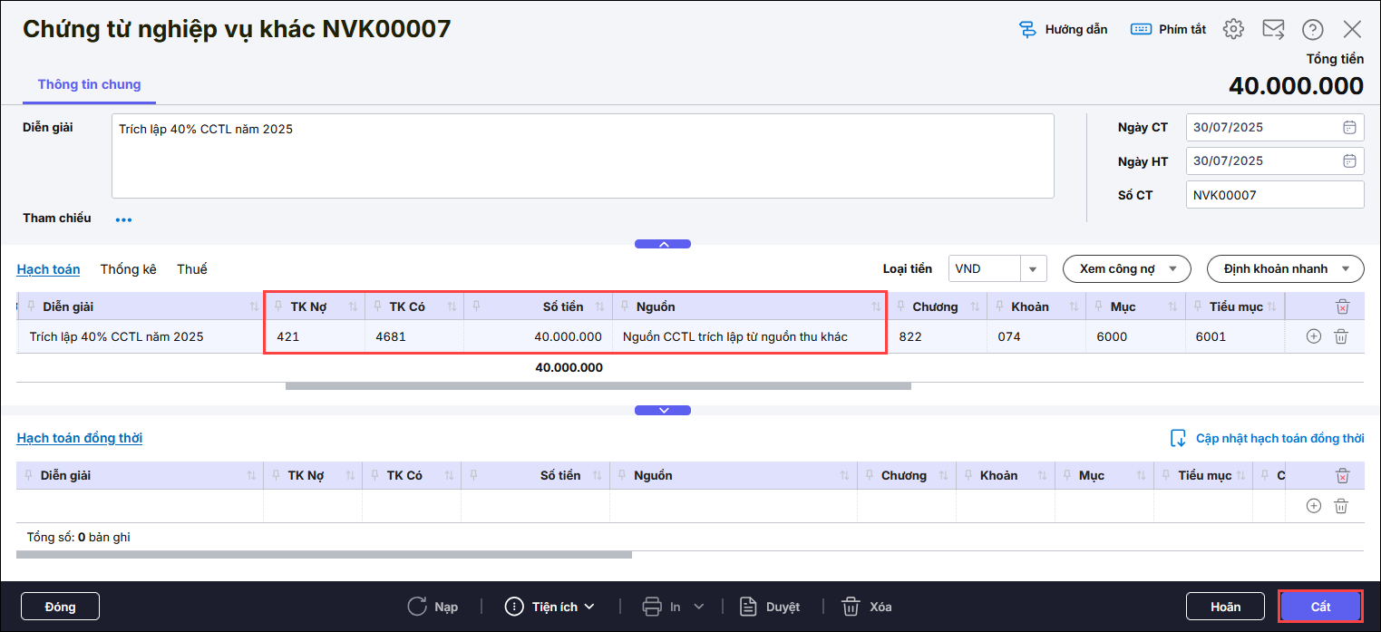 Bước 5: Nhấn Cất 5. Cuối năm, kết chuyển phần đã chi từ CCTLBước 1: Xác định kết quả hoạt động thao tác giống như hướng dẫn tại đây