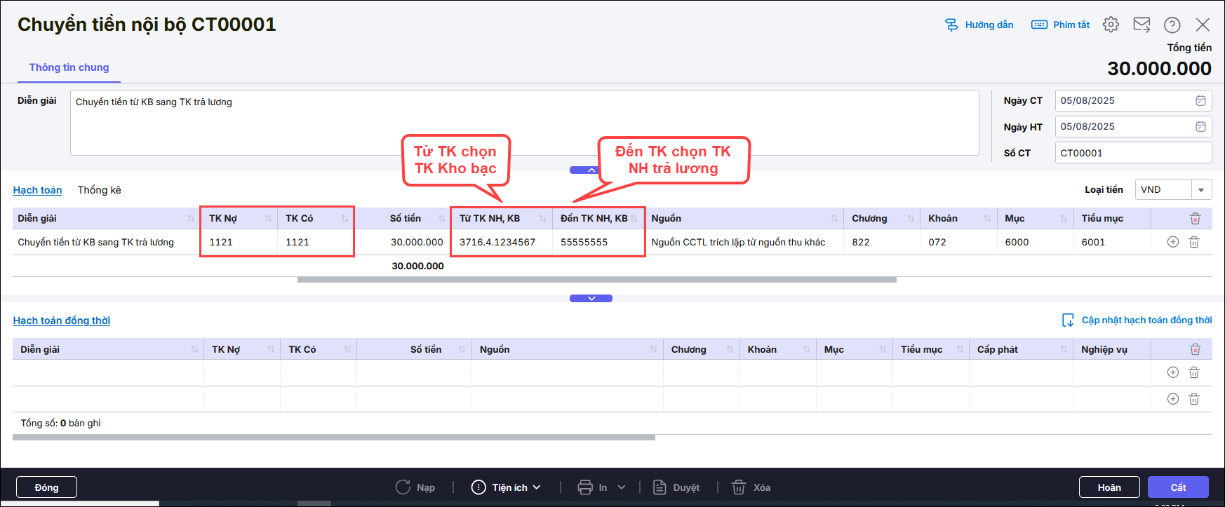 3. Khi chi lương từ nguồn CCTLBước 1: Chuyển lương từ TK kho bạc sang TK ngân hàng để trả lương: (Nếu đơn vị cần chuyển lương từ TK kho bạc => TK ngân hàng của đơn vị => TK ATM của từng cán bộ nhân viên).