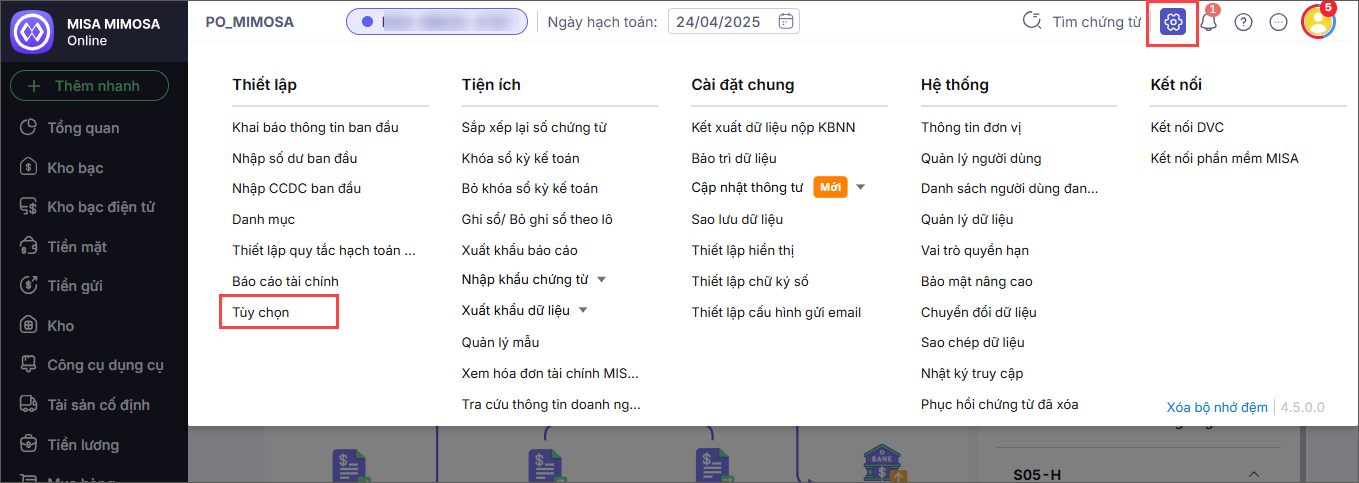 Lưu ý: Nếu anh/chị tích chọn Kho bạc ở tab Nghiệp vụ chung thì phần mềm sẽ hiển thị thiết lập cho phân hệ Kho bạc.