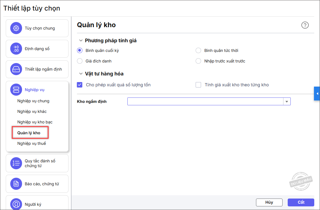Trên phần Quản lý kho, phần mềm cho phép thiết lập liên quan đến nghiệp vụ kho, xuất nhập, tồn kho, phương pháp tính giá, tùy chọn thời điểm tính giá, tùy chọn cho phép xuất kho quá số lượng tồn, kho ngầm định…