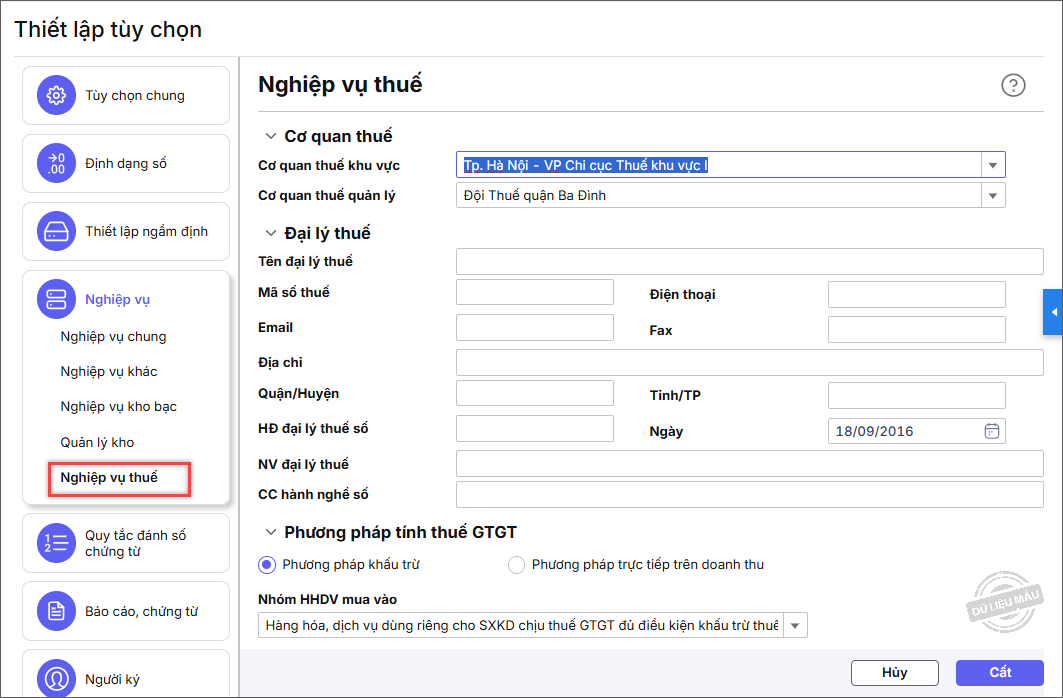 Trên phần Nghiệp vụ thuế, phần mềm cho phép thiết lập liên quan đến khai báo thuế như cơ cơ quan thuế, Đại lý thuế. Riêng phương pháp tính thuế không thay đổi được.