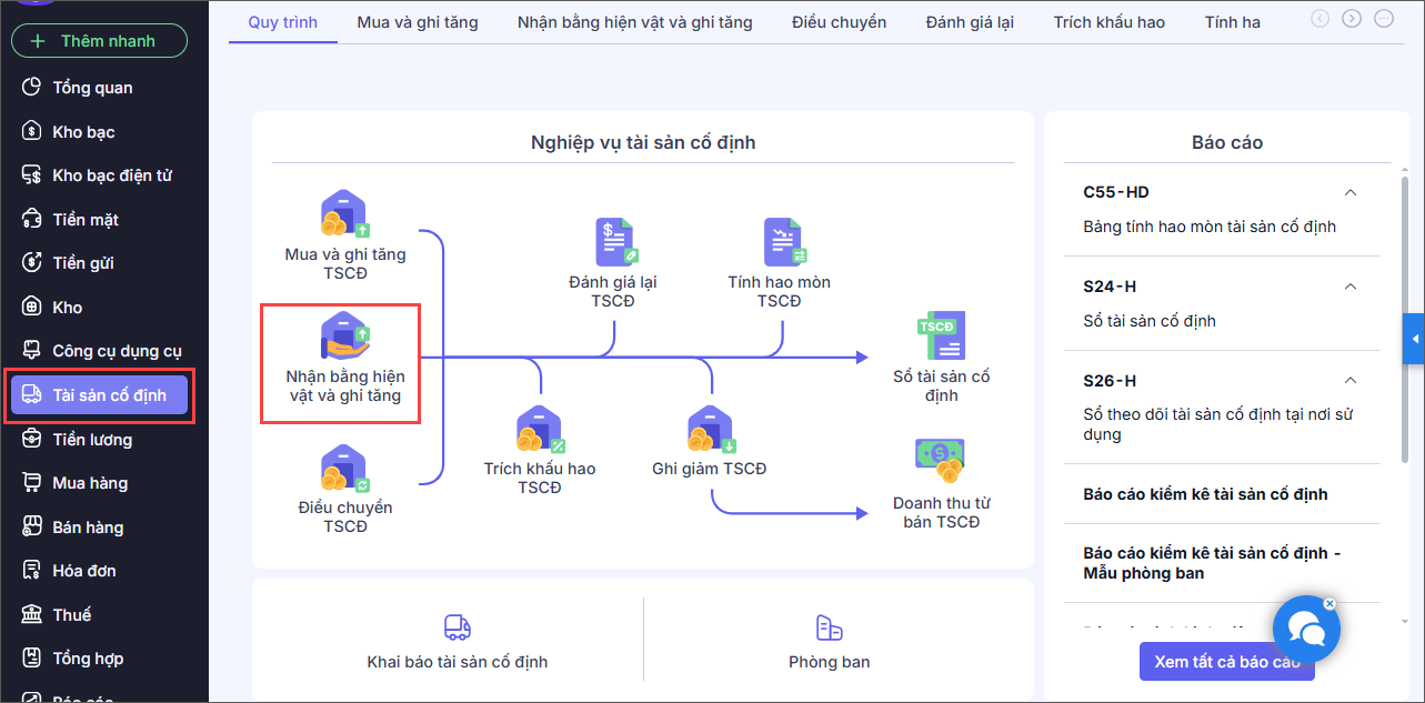 Hoặc vào nghiệp vụ Tài sản cố định\Nhận bằng hiện vật và ghi tăng.
