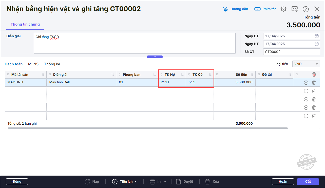 - Nhập thông tin chi tiết: Mã tài sản, Phòng ban, TK Nợ, TK Có, Số tiền.