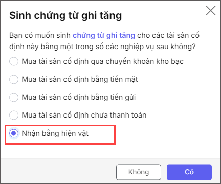Bước 5: Chọn nghiệp vụ ghi tăng Tài sản cố định là Nhận bằng hiện vật.
