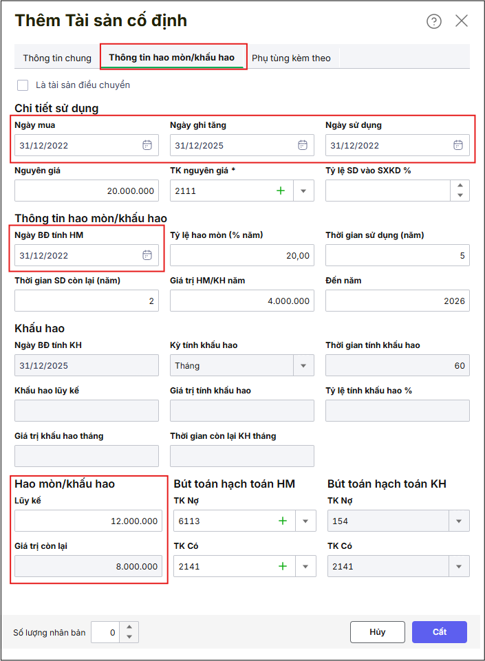 – Khai báo thông tin tại mục Thông tin hao mòn/khấu hao.