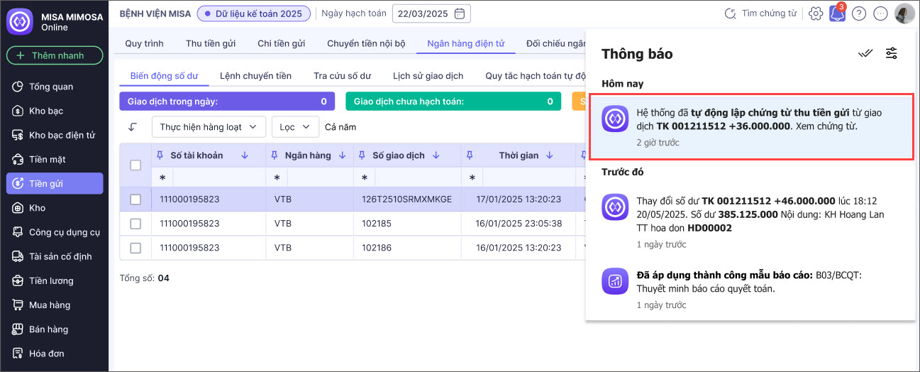 - Trường hợp chọn Phần mềm tự động lập chứng từ hạch toán đối với các giao dịch thỏa mãn quy tắc tại Mục 2.2: Hệ thống sẽ tự động lập chứng từ và thông báo tại phần quả chuông.