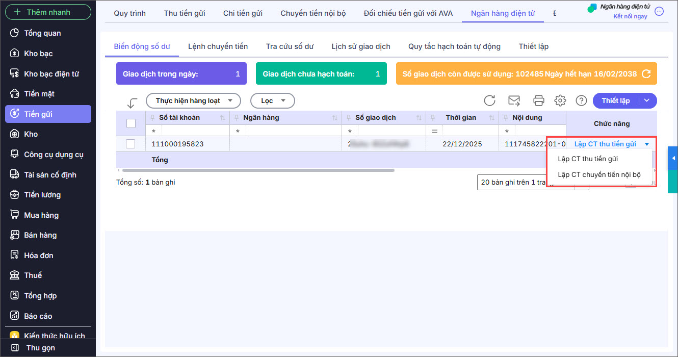 - Trường hợp chọn Người dùng tự lập chứng từ theo quy tắc được phần mềm gợi ý đối với các giao dịch thỏa mãn quy tắc tại Mục 2.2: Nhấn Lập chứng từ Thu tiền gửi/Chi tiền gửi/Chuyển tiền nội bộ tại giao dịch cần hạch toán.