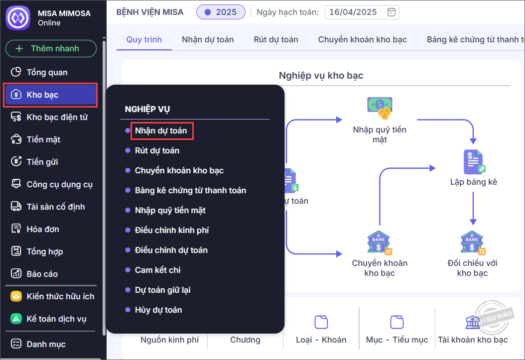 Bước 1: Di chuột vào nghiệp vụ Kho bạc, chọn Nhận dự toán.