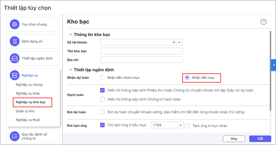 - Phần mềm mặc định nhận dự toán chi tiết đến nhóm mục. Trường hợp dự toán bổ sung được giao đến Mục thì cần phải thiết lập cho phép Nhận dự toán chi tiết tới Mục tại Thiết lập\Tùy chọn\Nghiệp vụ kho bạc và tích vào ô Nhận đến mục.