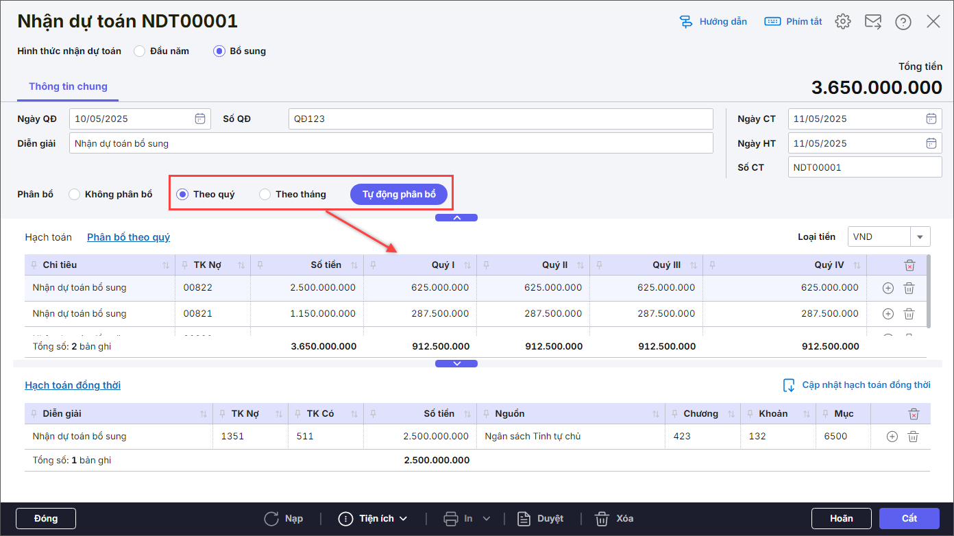 Lưu ý: Nếu phân bổ dự toán theo Quý hoặc Tháng thì thực hiện như sau: