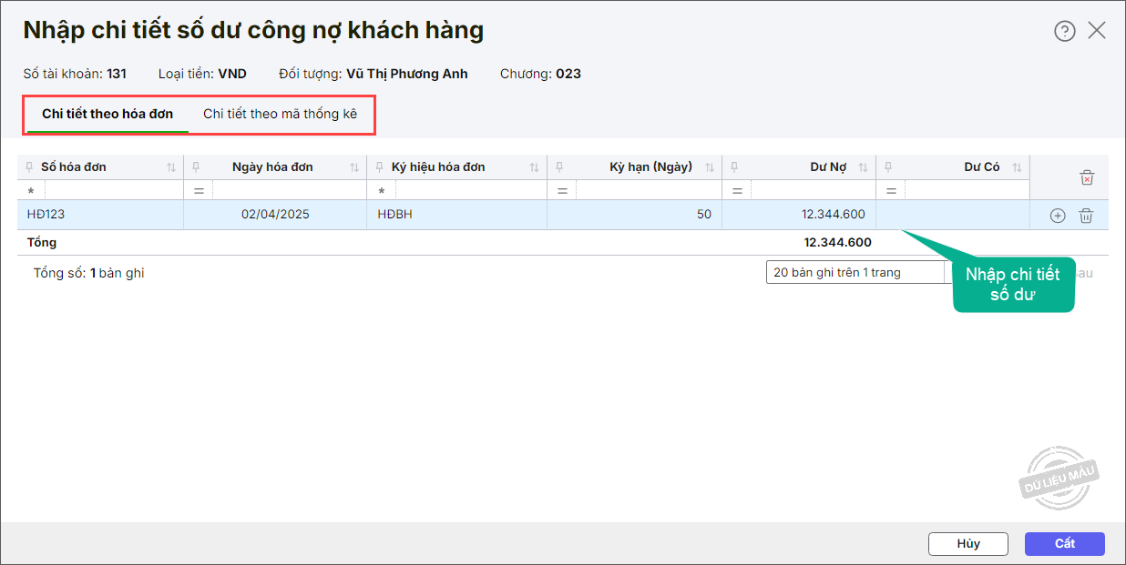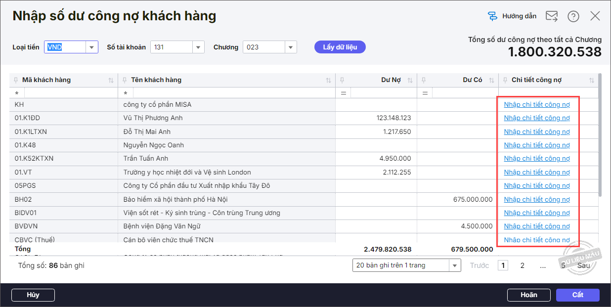 • Nhấn Nhập chi tiết công nợ.