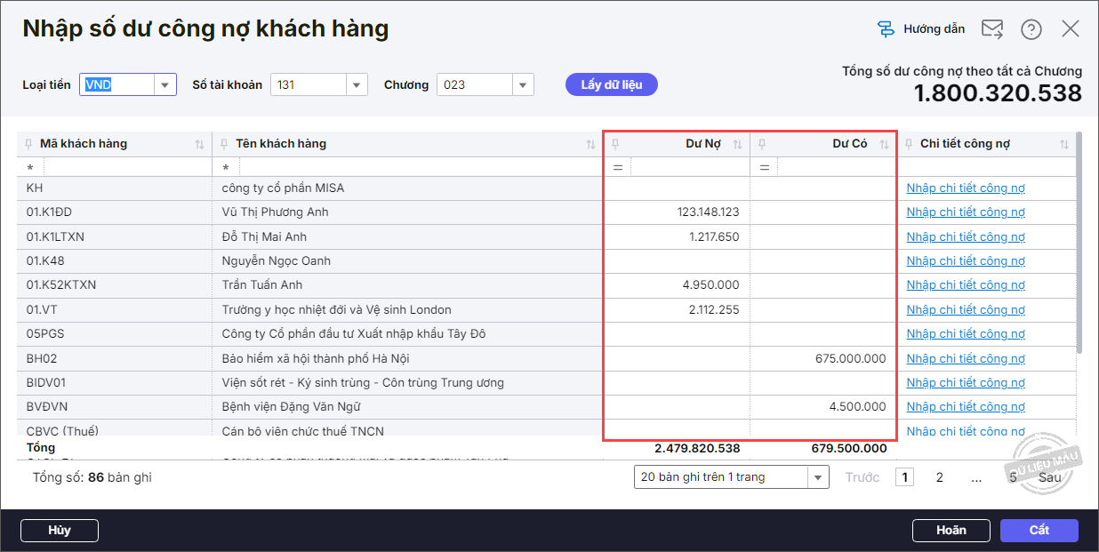 • Nhập chi tiết số dư công nợ khách hàng.