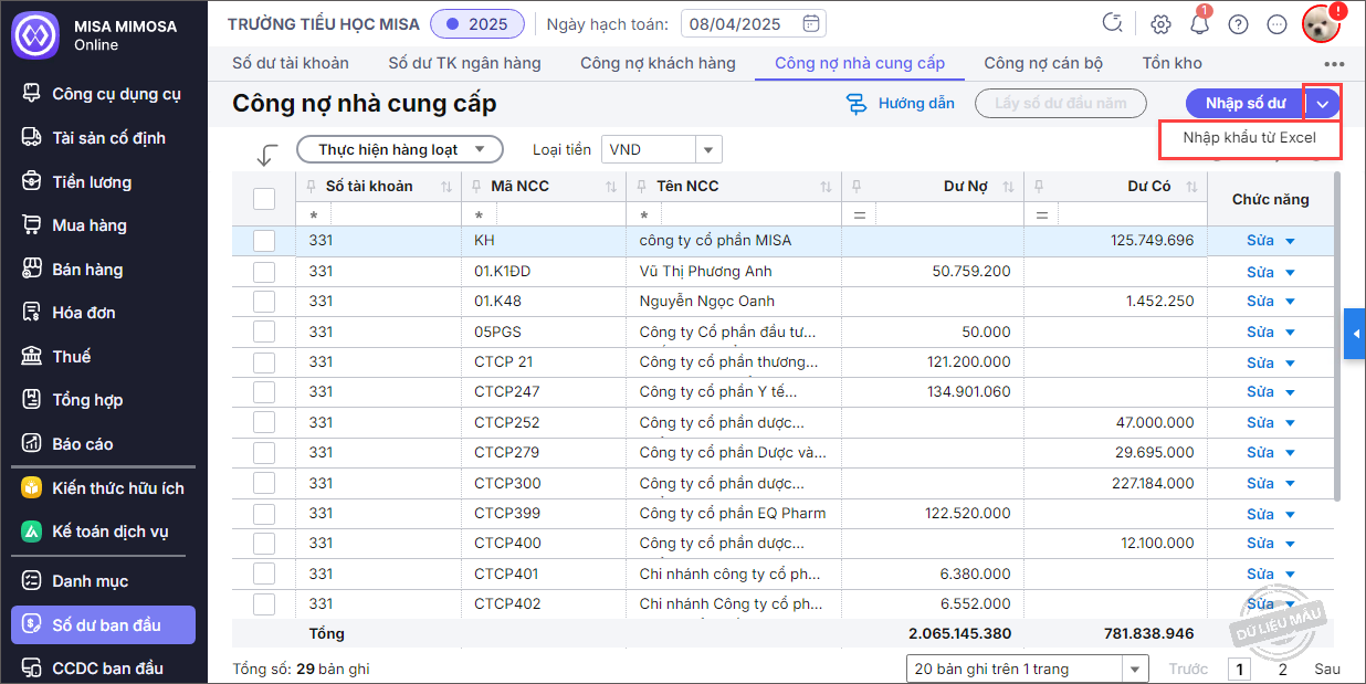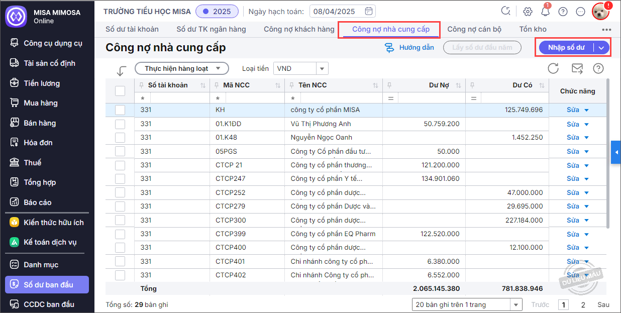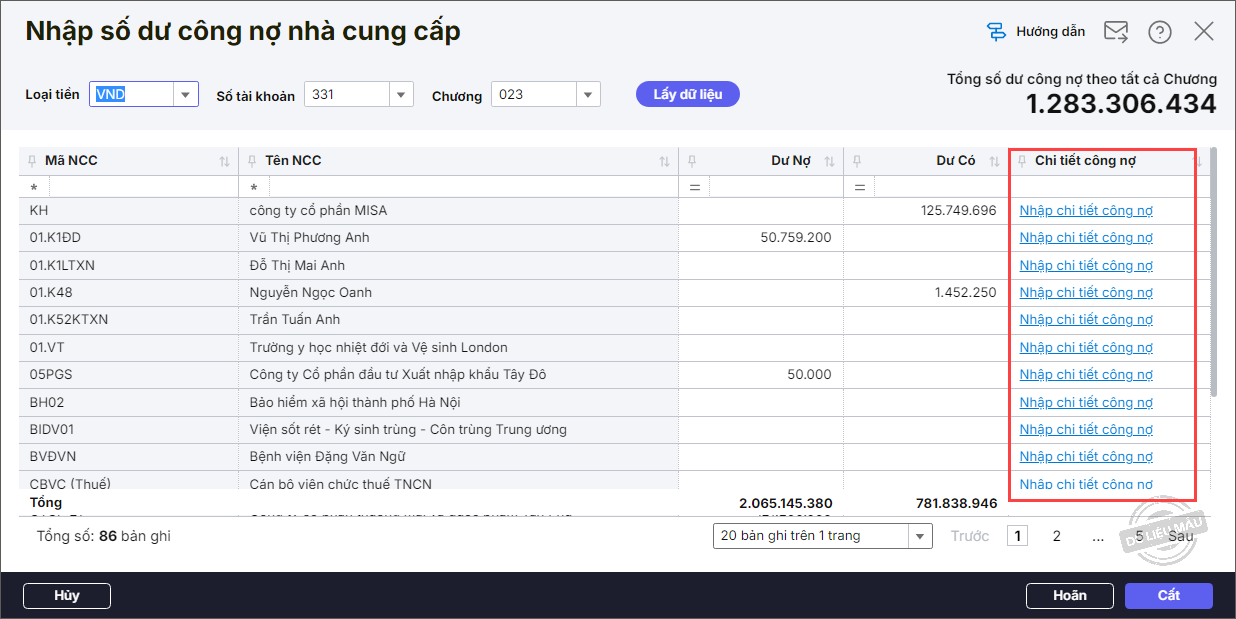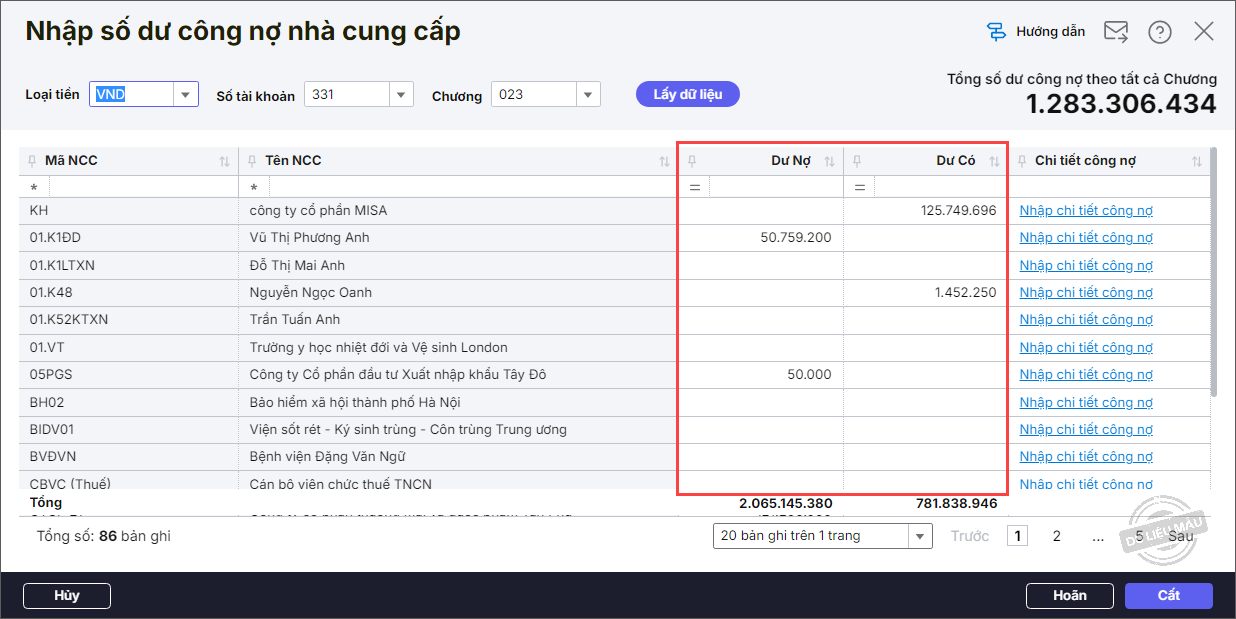 - Nhập chi tiết số dư công nợ nhà cung cấp.