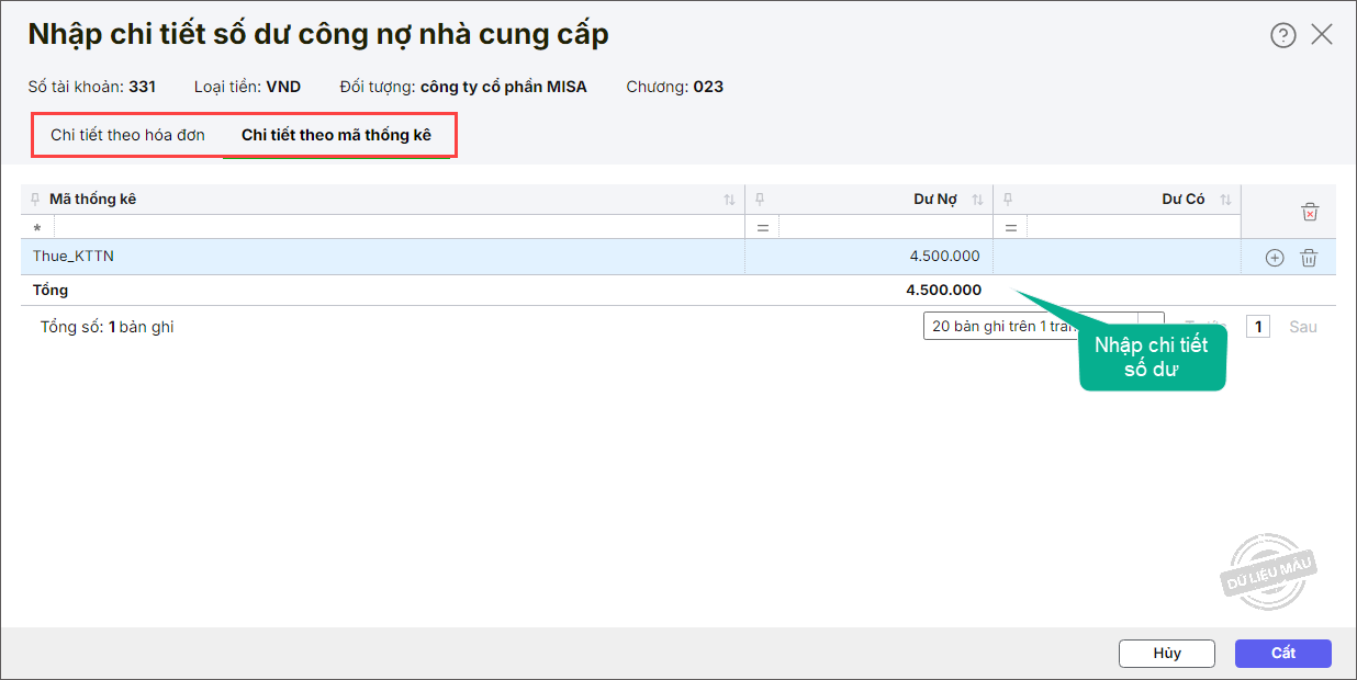 - Trong 1 Mã thống kê, nếu anh/chị nhập cả Dư Nợ và Dư Có thì khi nhấn Cất, hệ thống sẽ tự động lấy Tổng số dư bên Nợ – Tổng số dư bên Có để cập nhật ra giao diện Nhập số dư công nợ nhà cung cấp. => Nếu chênh lệch > 0 thì cập nhật vào cột Dư Nợ, ngược lại < 0 thì cập nhật vào cột Dư Có.