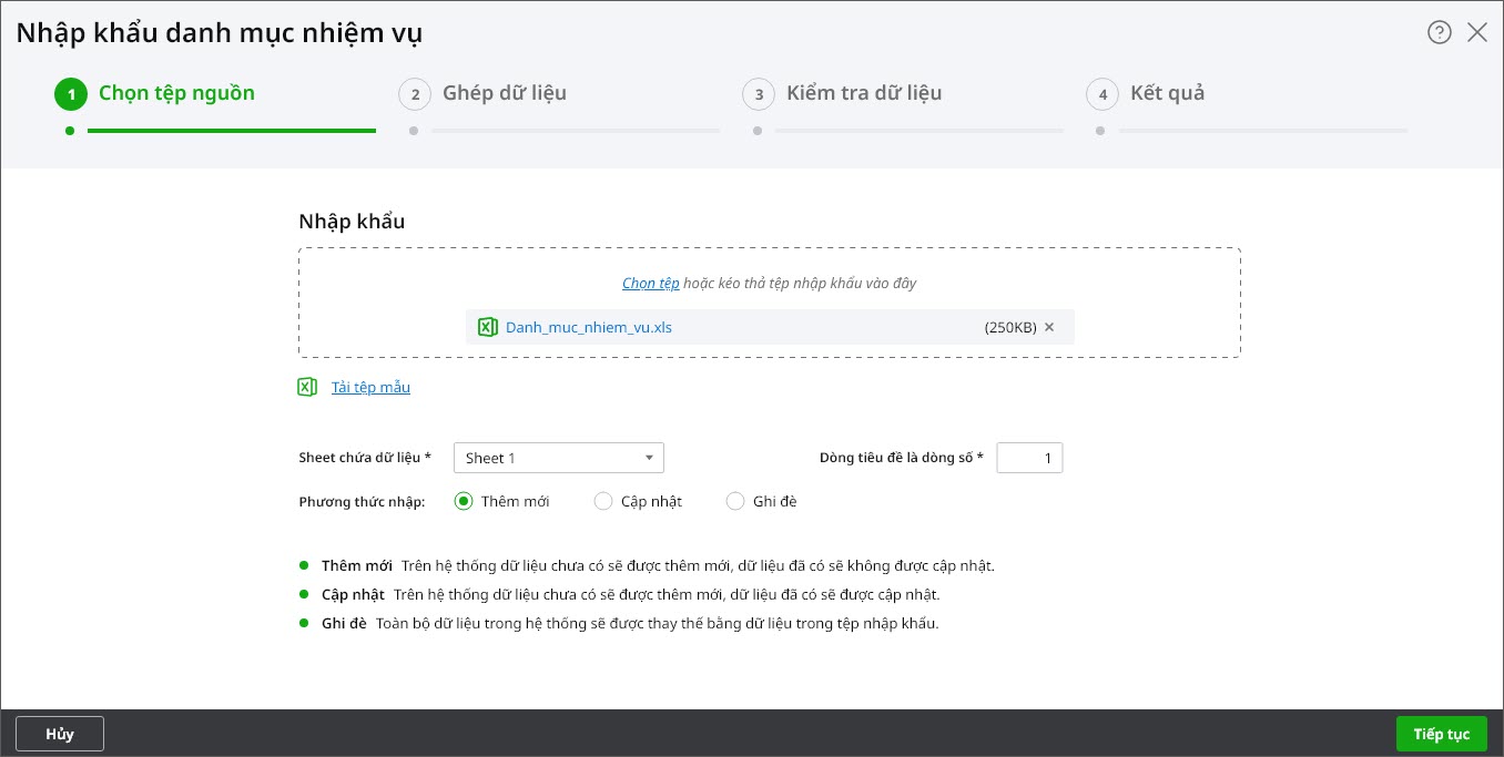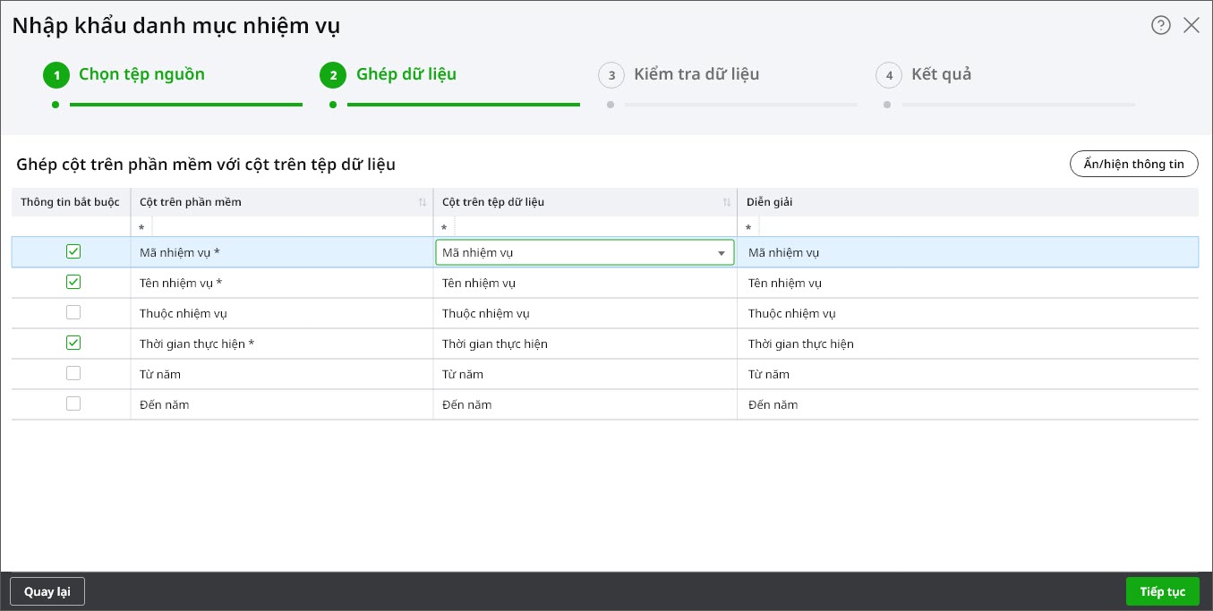 • Hệ thống sẽ tự động ghép các cột trên tệp dữ liệu với cột trên trên phần mềm. Nếu hệ thống không ghép được cột hoặc ghép chưa đúng thì anh/chị có thể tự chọn lại cột ở cột trên tệp dữ liệu cho chính xác nhất.